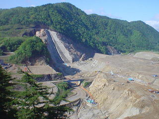 | 建設中の胆沢ダムと水没する石渕ダム | |
