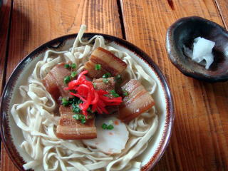 | 木や草を燃やし、灰の上水を天然カン水に利用する沖縄伝統の製法で麺を打っているそうです。 昆布ダシが効き、さっぱりして美味しい。 |