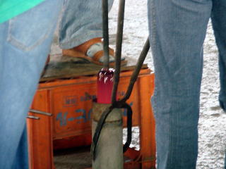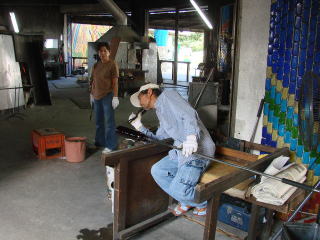 | 炉の前は非常に熱い、1,400度です | 赤くなったガラス |