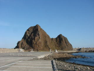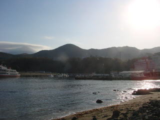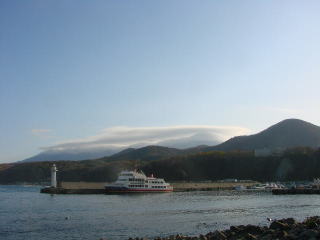 | ホテルを出て、ウトロ港へ行ってみました。 観光船の運航確認です。 変わった岩がありました。 |