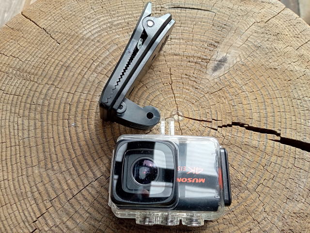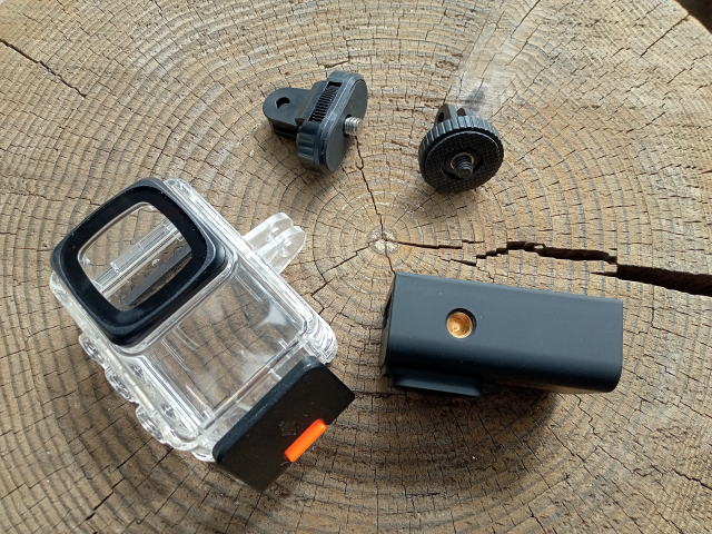 左は首掛け用、右下はクリップ、右上の2つは変換アダプタ