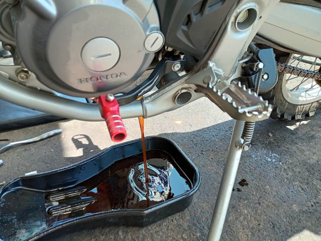 | 車体を立てて、しっかりオイルを出します | |