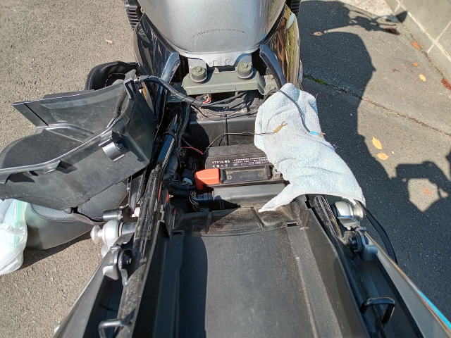 バイク屋さんより新品バッテリーを購入、青いのは添加剤で、ついでに購入